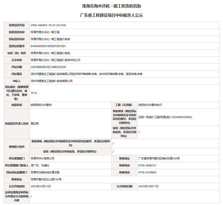 珠海市海水淡化一期工程造价咨询中标候选人公示